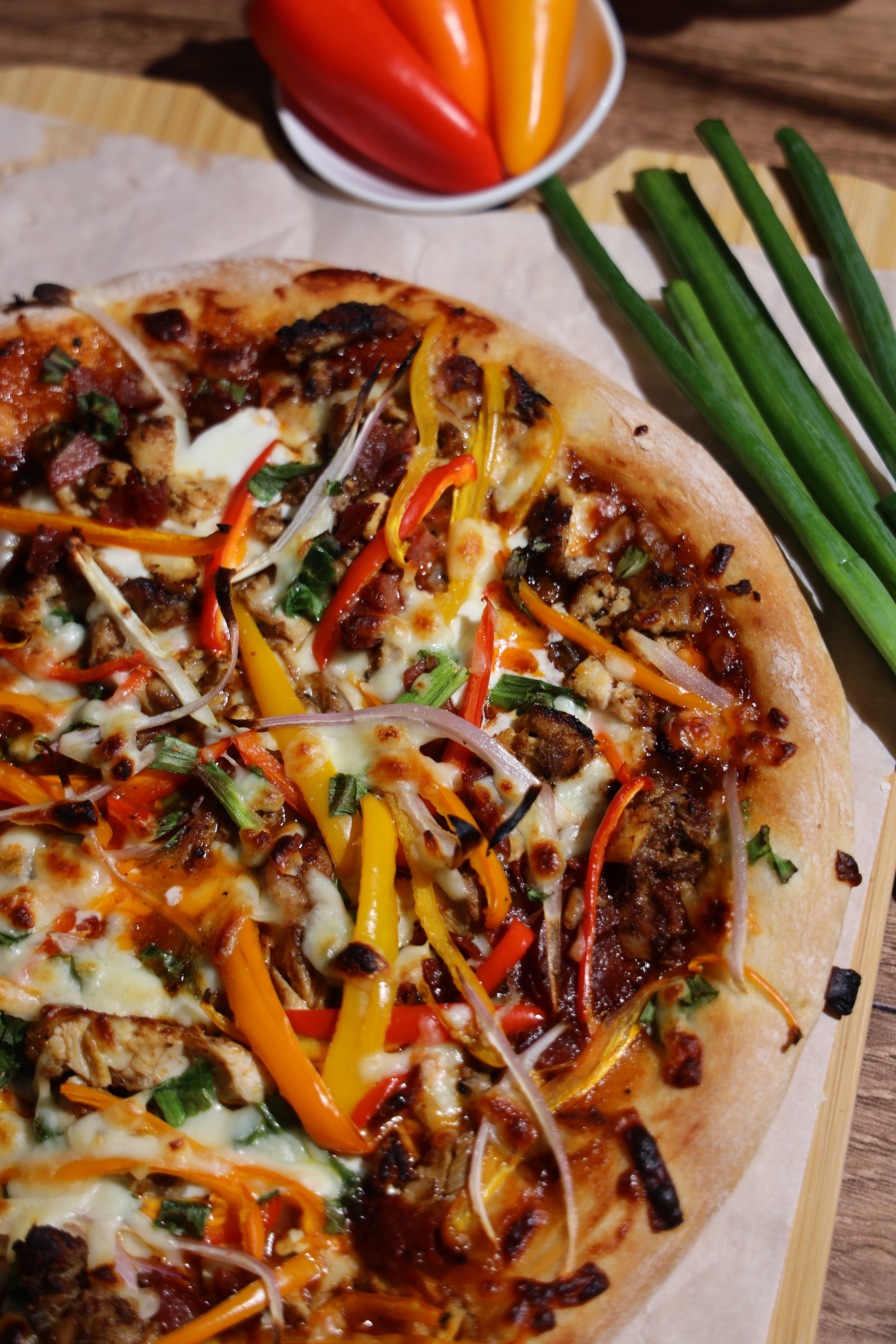 - To assemble the pizza, spread the sauce from the center of the stretched pizza dough outward. Add a layer of sliced mozzarella cheese, chopped jerk chicken, bacon, sweet peppers, sliced shallots, and green onions. Top with Colby jack cheese and more mozzarella.